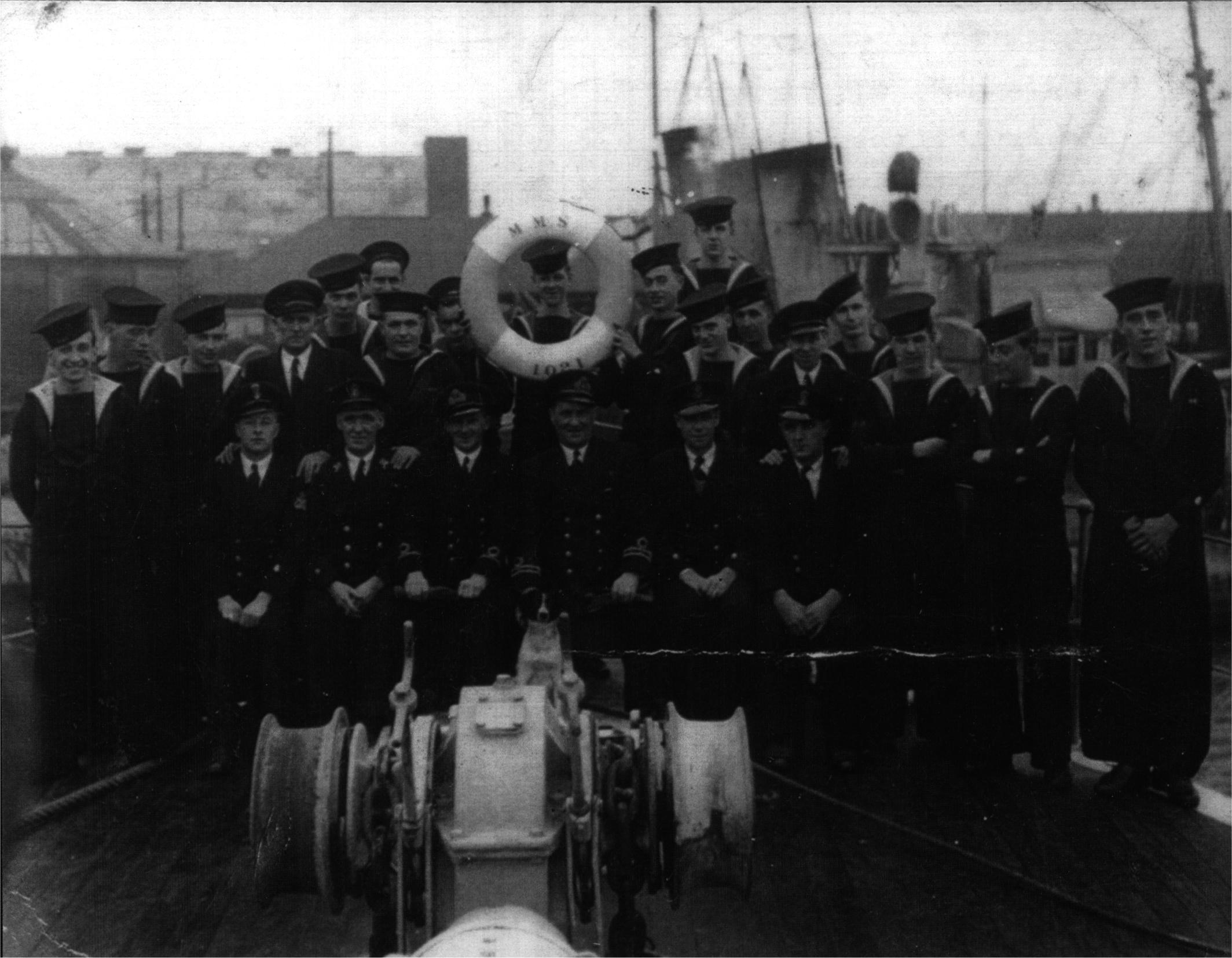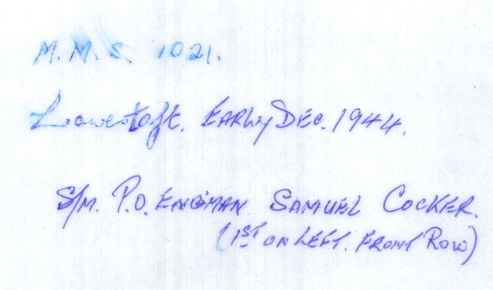 0000005 | "Modern gloss reprint of crew of MMS 1021, Early Dec. 1944. Slight blue cast" | """M.M.S. 1021. | Lowestoft. Early Dec. 1944. | S/M. P.O. Eng'man Samuel Cocker. | (1st on Left, Front Row)"" [Sam Cocker's handwriting]" | early Dec. 1942 | Print | BW | Gloss | 18.2 | 14.0 | |