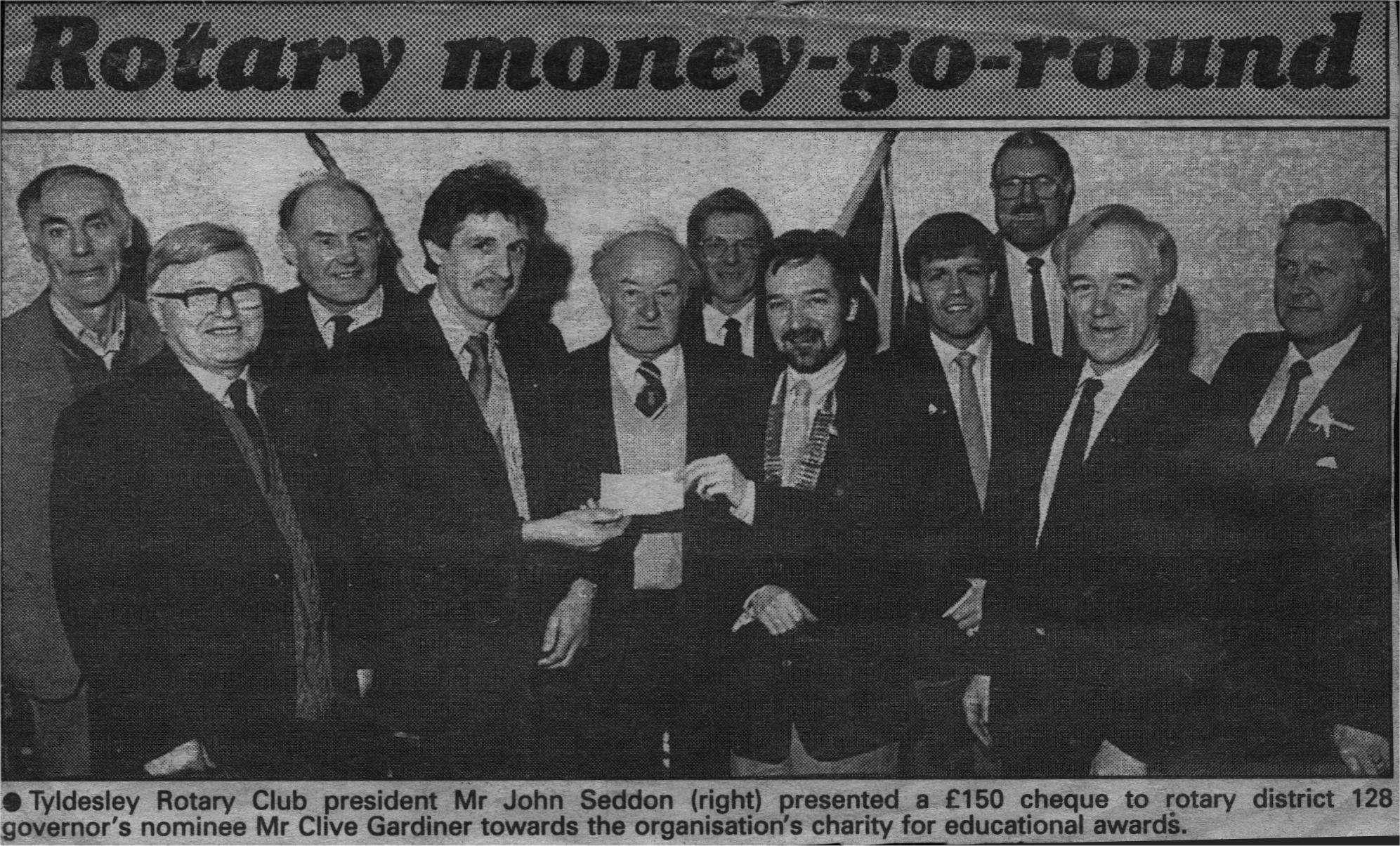 0000008 | "Probably from the Journal, date unknown. Samuel Cocker standing directly behind the cheque. 2nd right Bill Mercer. Far left Joe Withington" | """Tyldesley Rotary Club president Mr John Seddon (right) presented a œ150 cheque to rotary district 128 governor's nominee Mr Clive Gardiner towards the organisation's charity for educational awards.""" | | Newspaper | BW | News | 16.9 | 10.2 | |
