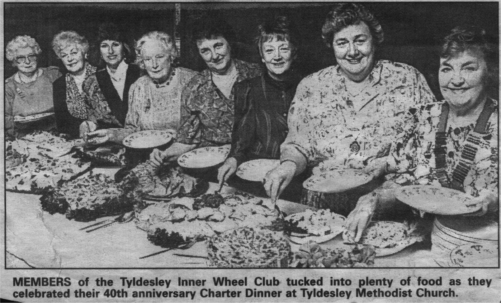 0000009 | "Edith Cocker, far left. Mona Dando far right." | """MEMBERS of the Tyldesley Inner Wheel Club tucked into plenty of food as they celebrated their 40th anniversary Charter Dinner at Tyldesley Methodist Church.""" | | Newspaper | BW | News | 15.0 | 9.5 | |
