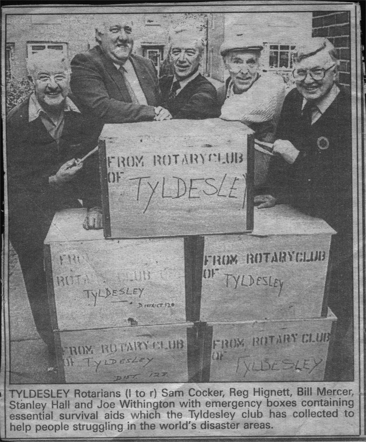 0000010 | "L to R Sam Cocker, Reg Hignett, Bill Mercer, Stanley Hall and Joe Withington" | """TYLDESLEY Rotarians (I to r) Sam Cocker, Reg Hignett, Bill Mercer, Stanley Hall and Joe Withington with emergency boxes containing essential survival aids which the Tyldesley Club has collected to help people struggling in the world's disaster areas.""" | | Newspaper | BW | News | 10.8 | 12.8 | |