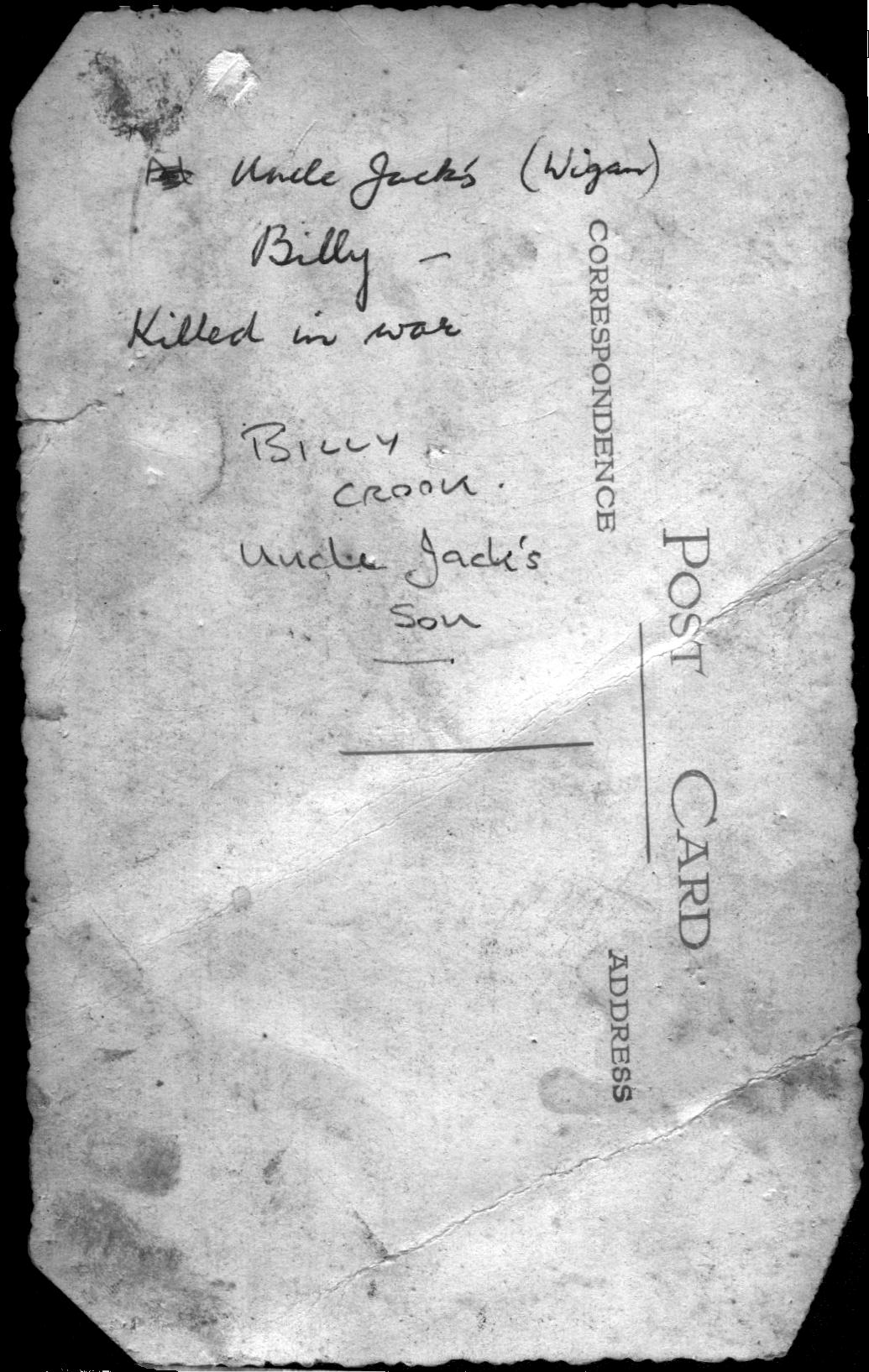0000016 | "Postcard of Billy Crook, son of Jack Crook. Date unknown. Billy was killed during WWII. " | "Uncle Jack's (Wigan)