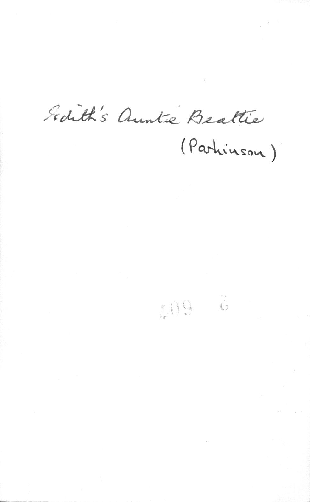 0000027 | "Beattie Parkinson, aunt of Edith Cocker (nee Parkinson)" | """2 607"" [stamped]